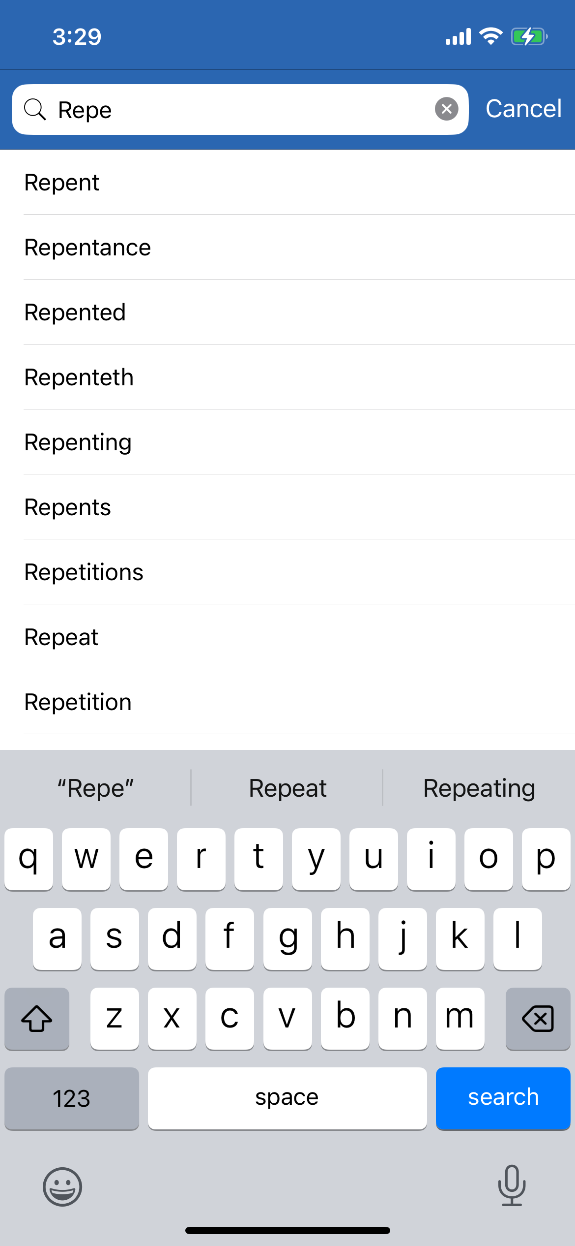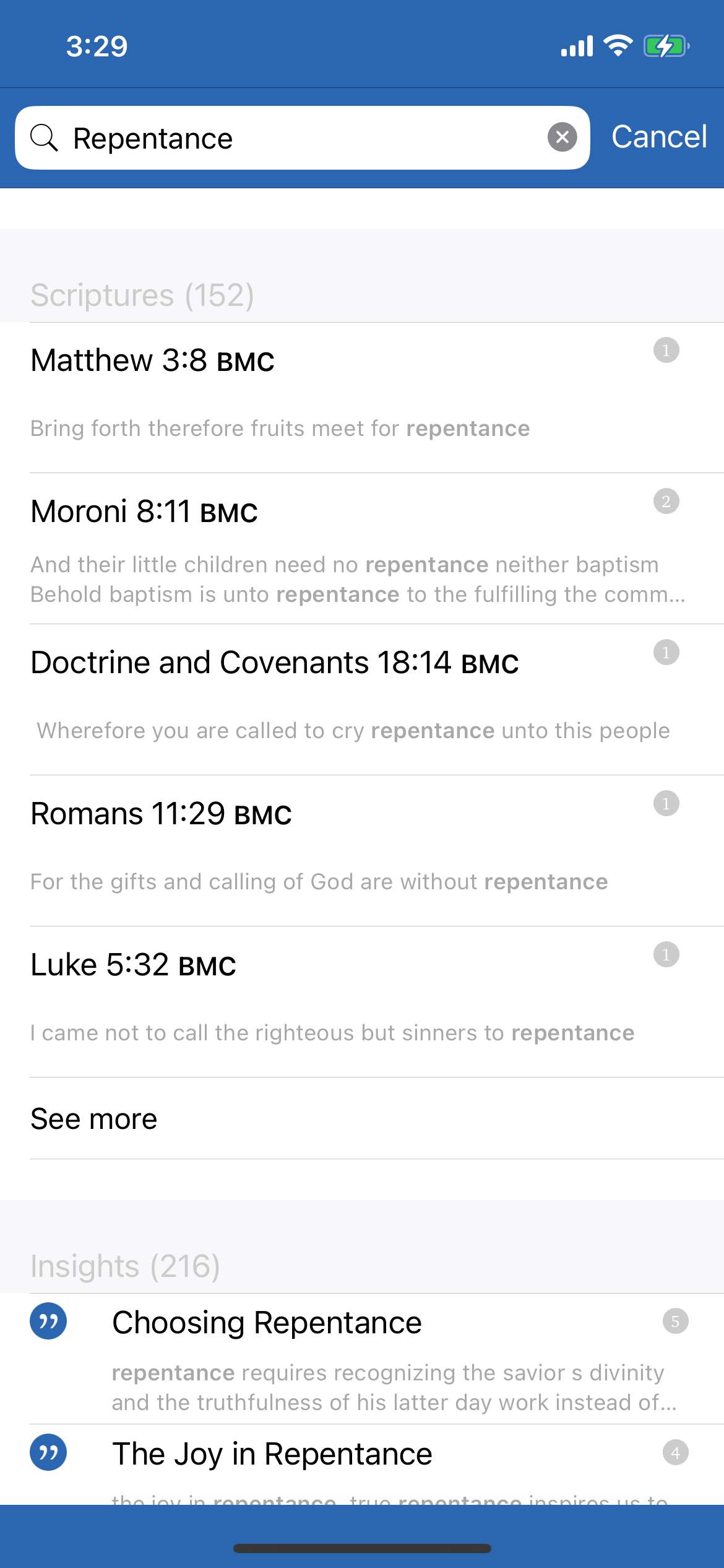 When the used selected a search result, it led to a pop-up with the passage referred to and the ability to navigate to that passage. However, there was no way to go back to the search results. I added a bar to the top of the scripture page that will alert the user that they can navigate back to the search results. This is easily dismissable by clicking the “x” in the corner. Finally, if the scripture passage contains the search terms, those are shown in bright blue.