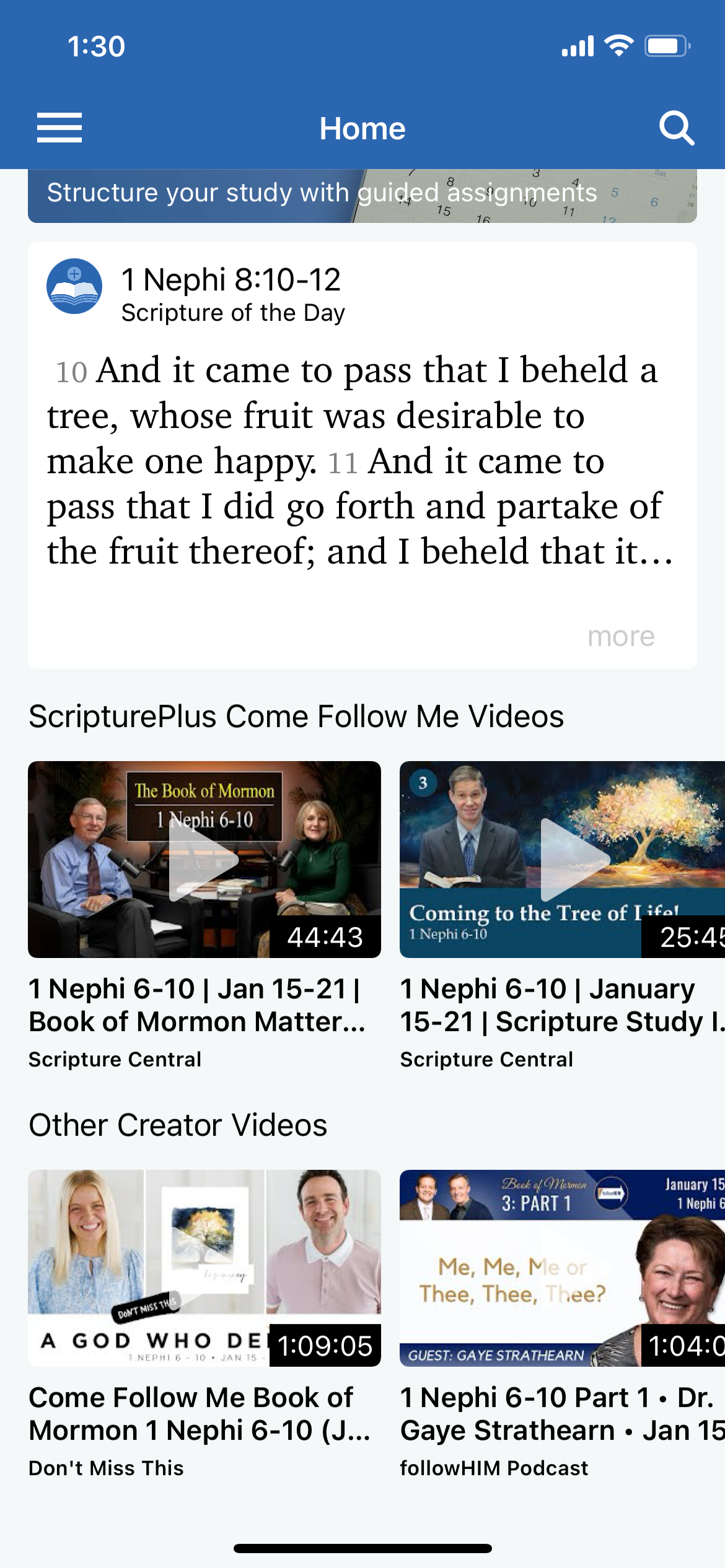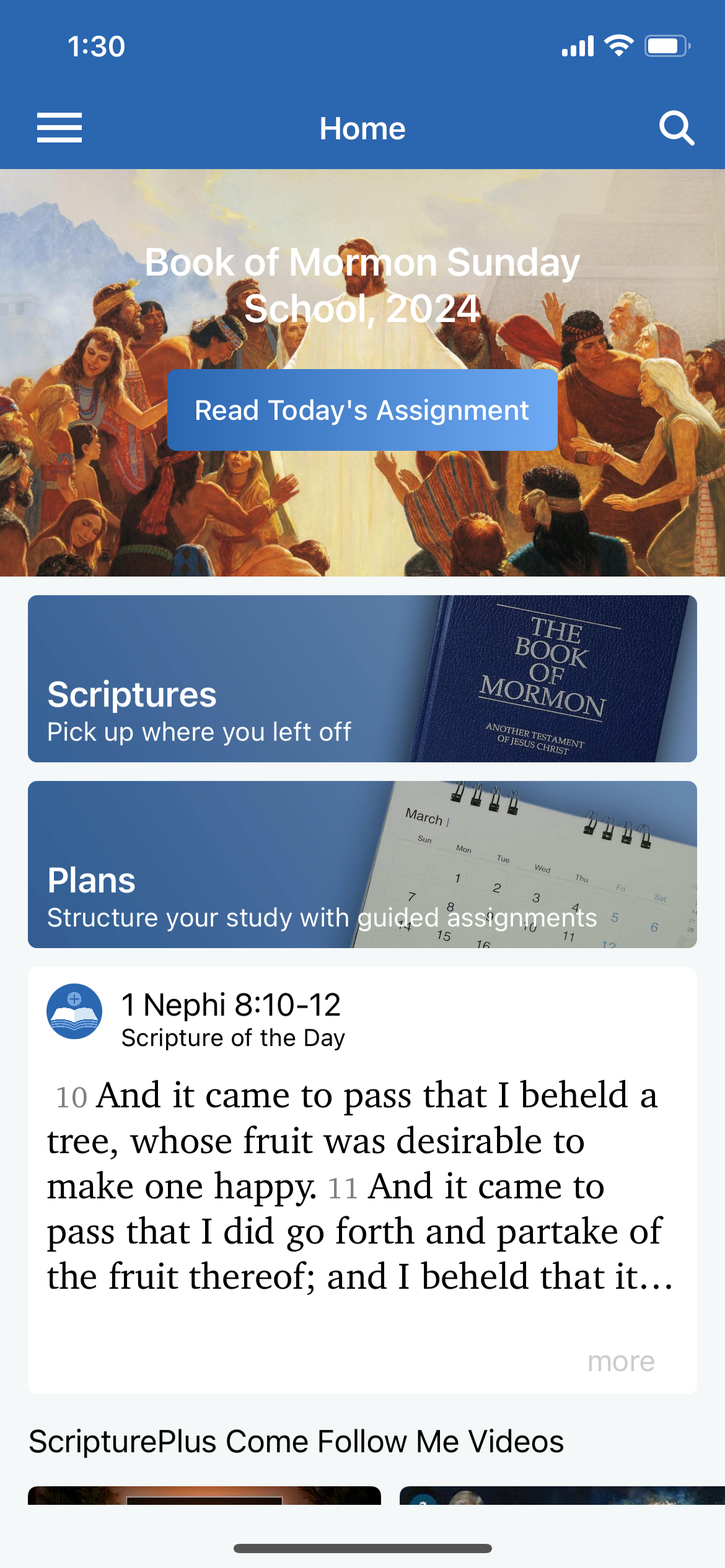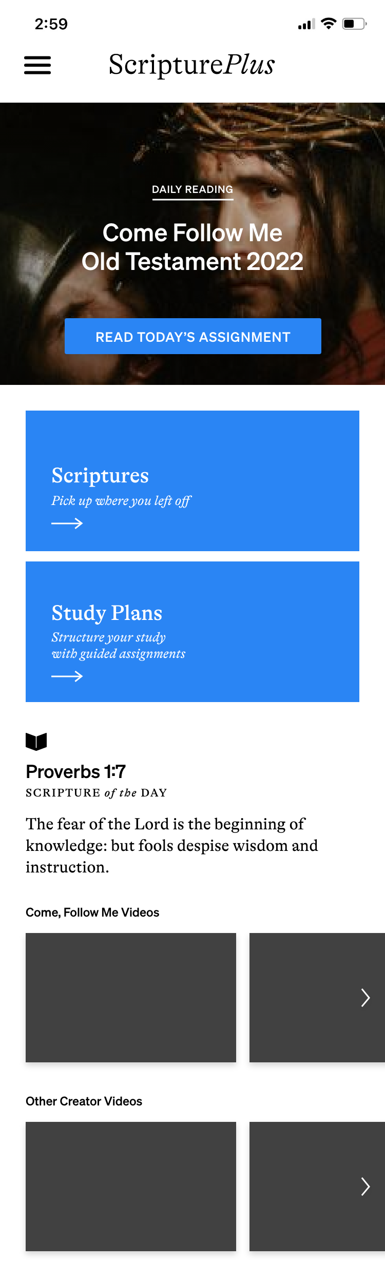 Moving down, we have the “Scripture of the Day” area. Again, there was the same issue before where the text was not given enough breathing room. In order to read the full scripture, you had to tap it, upon which a pop-up would open with the full passage. However, since the scripture of the day is at most a few verses, I opted to display the full scripture of the day on the landing screen in my redesign. This feels more simple and easy. The scripture citation is larger and bolded, to draw attention to it and differentiate it from the subtitle “Scripture of the Day.”