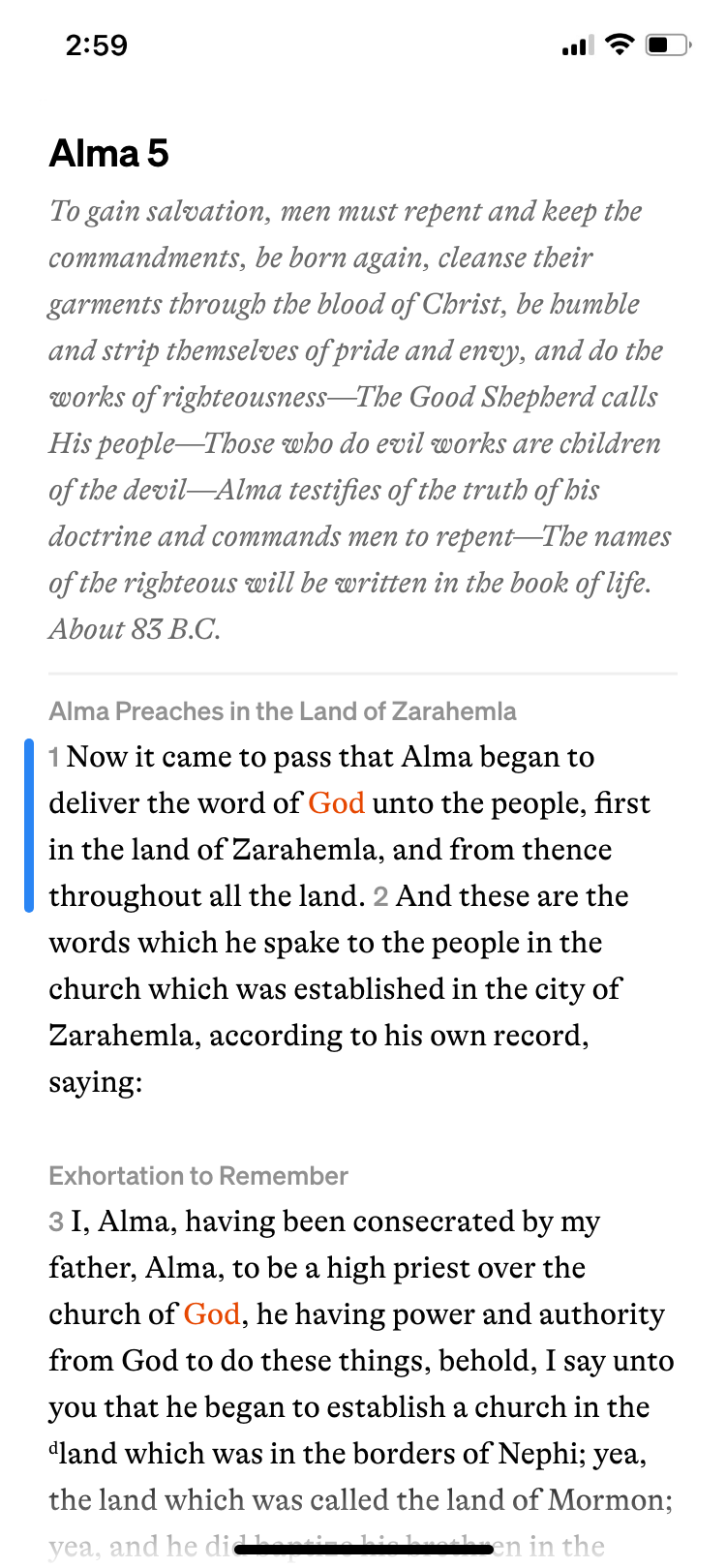 To the immediate left is the scrubber view. The app is set up to have the scriptures on an infinite scroll. If the user begins to scroll continuously, the scrubber on the right hand side of the screen will pop up and they can grab hold of it and drag it down the screen to accelerate their scrolling. The indicator in the middle shows the location as the user scrolls. Both items disappear as the user stops scrolling.
