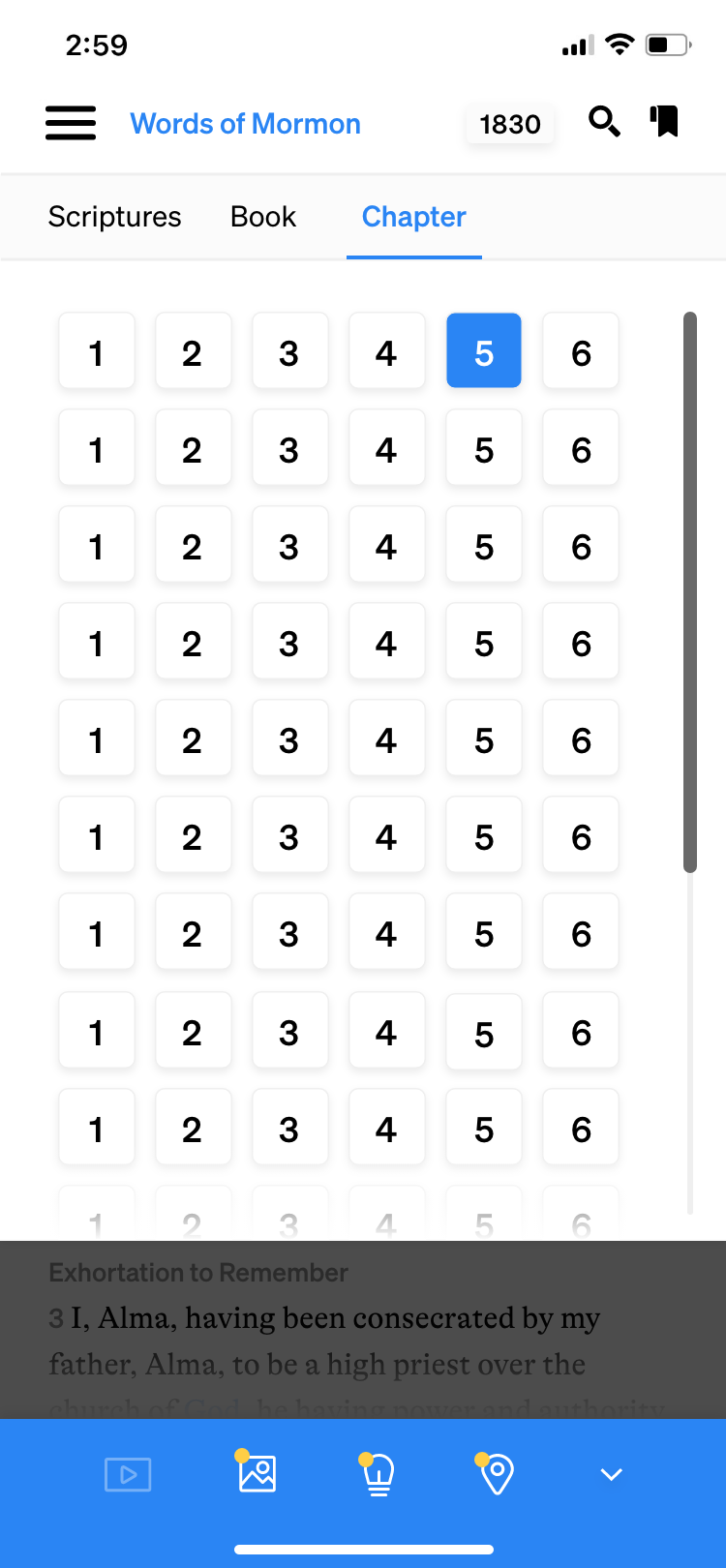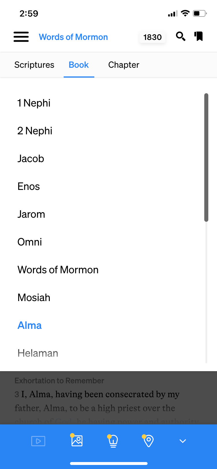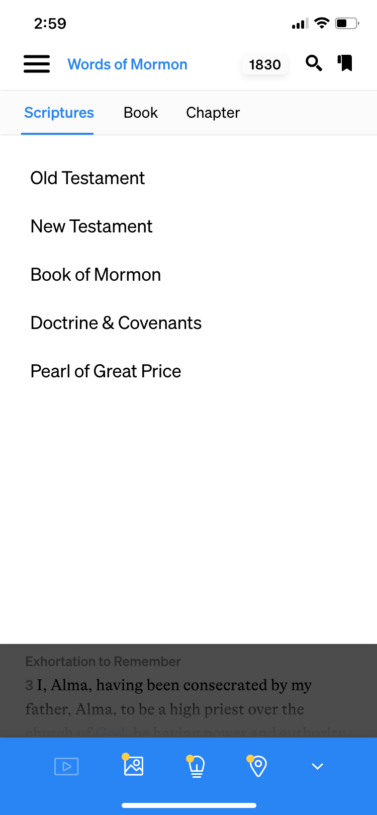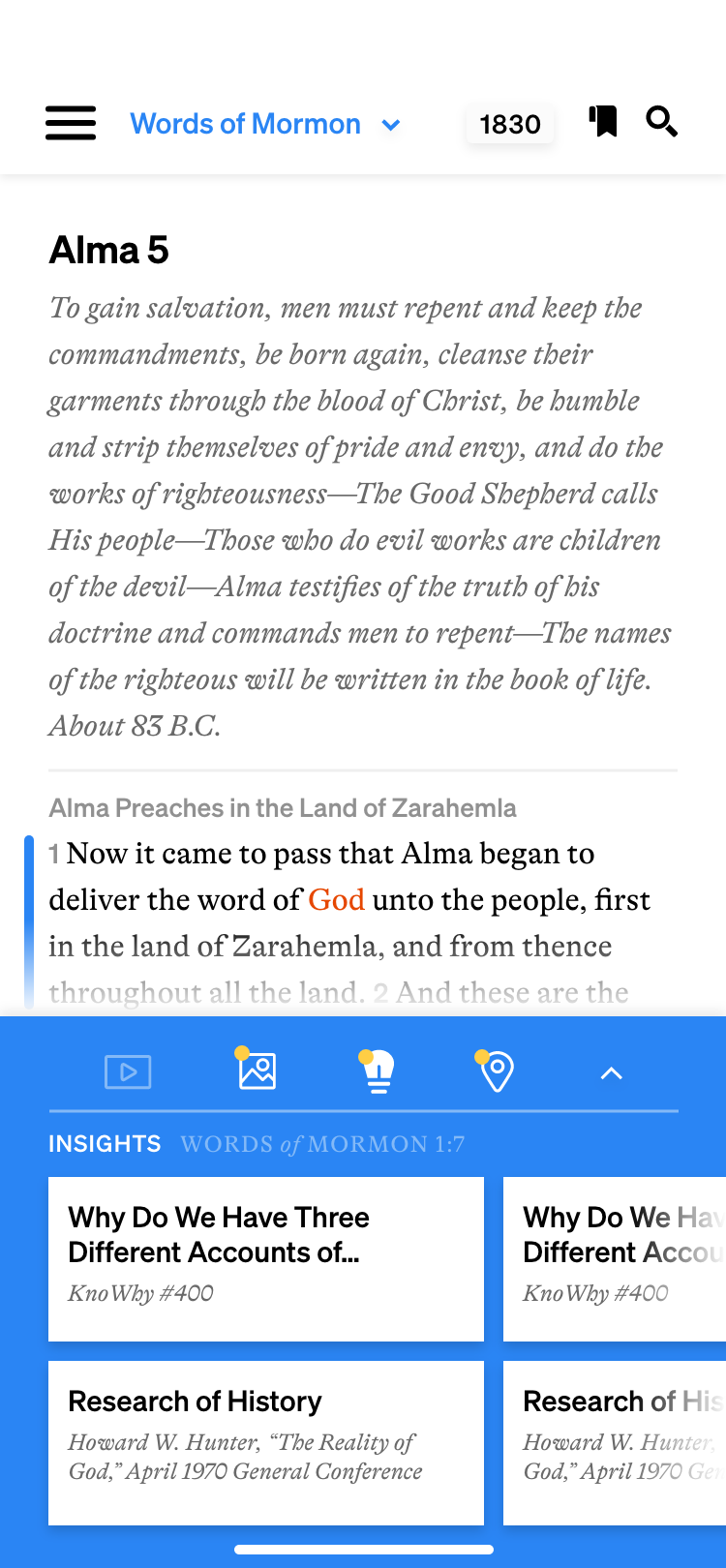 For the top navigation, I softened the look of the hamburger menu, and left-aligned the text with the current book of scripture, which is shown in bright blue and has a drop-down arrow to indicate usability. Additionally, in the previous version of the app, you could choose which translation or version of the book of scripture to read, but it was very difficult to find where to toggle between different versions. I updated that feature, adding it to the top nav here where it says “1830.” Each version of the scriptures has a 4-character abbreviation, but if you tap “1830” you can see the full titles of each version and easily toggle between them. This is especially helpful if you’d like to see the differences in one verse between different published versions or translations of the scriptures. Finally, I simply redrew the bookmark and search icons.