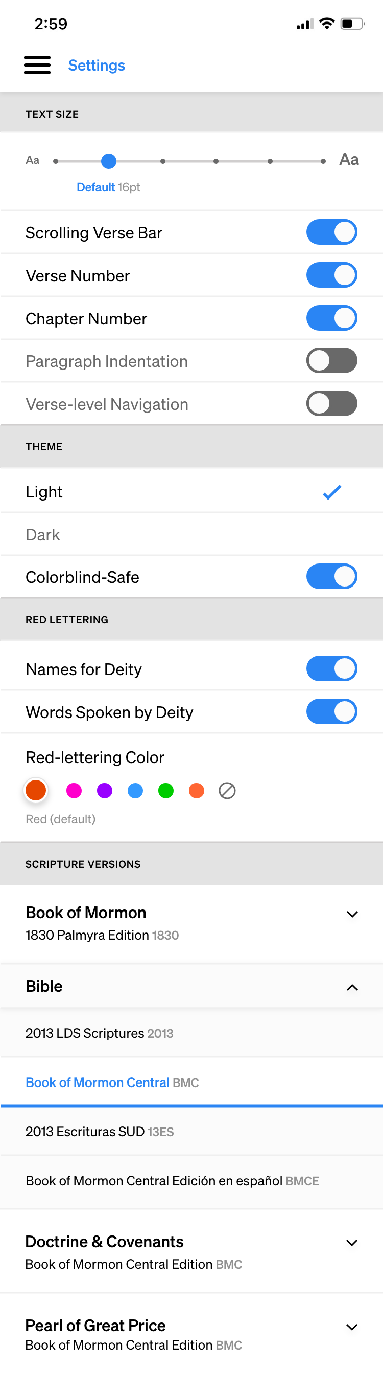 Other additions to the settings menu include the alternate red-lettering colors and the area to select which version of the scriptures the user would like to have shown.