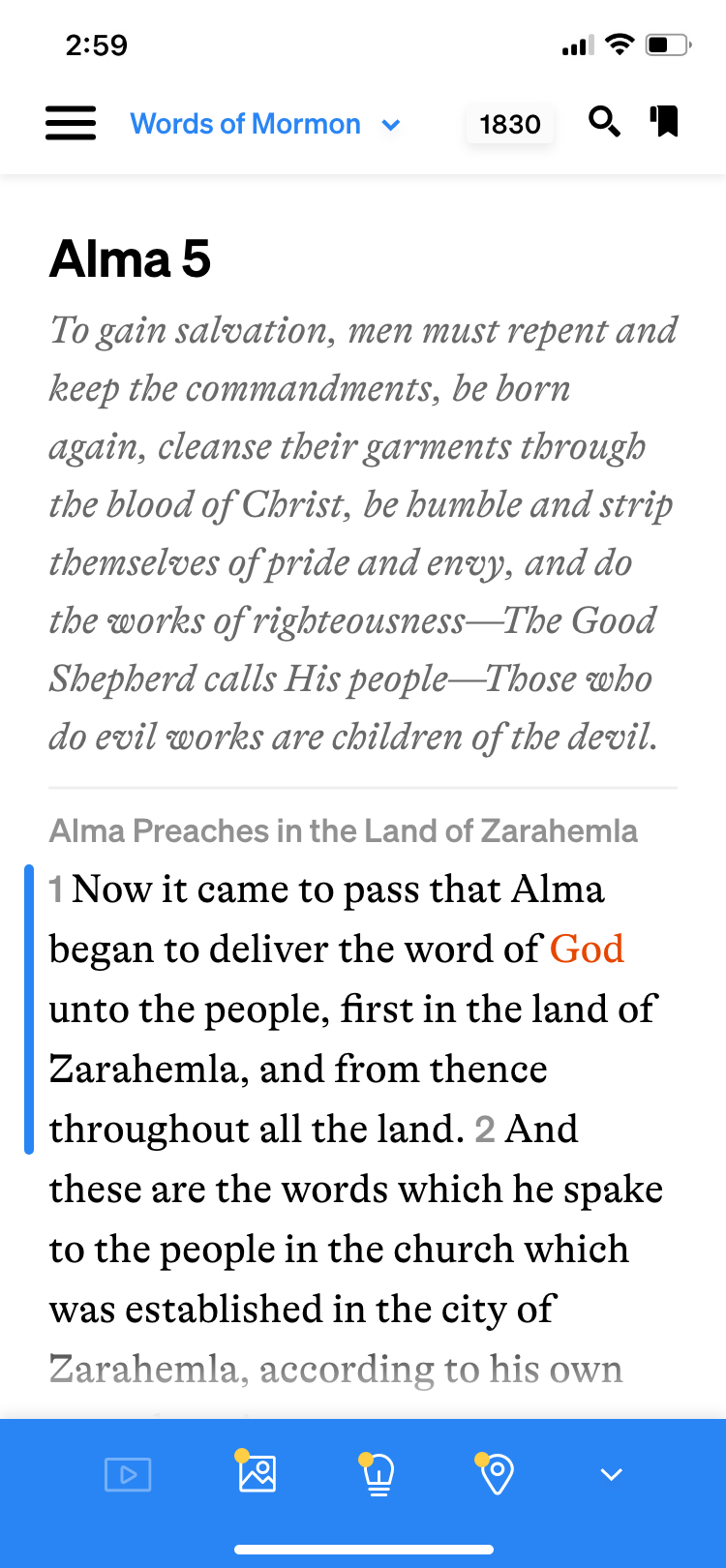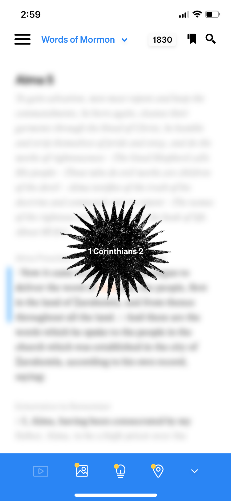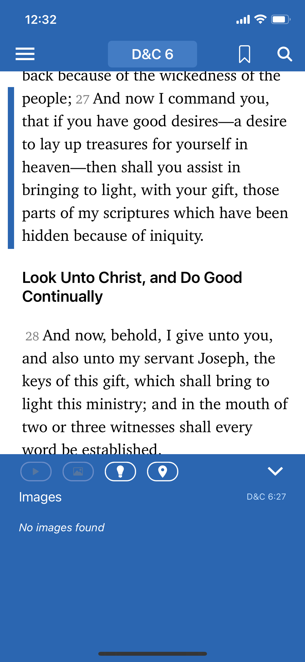 Previously, as soon as you entered the scriptures, the default was to have the bottom bar open. It took up about 30% of the screen and overshadowed the scriptures in weight with its deep blue color. The bottom bar adds context to the scriptures; on the left, the floating blue bar indicates the active verse, and as the user scrolls down, the blue bar follows their progress. The bottom bar correlates with this selected verse and suggests associated videos, images, insights, and historical setting information. While this may be helpful, I recommended defaulting to having this area collapsed unless tapped, so the reader can focus on the scriptures, the true purpose of this screen.