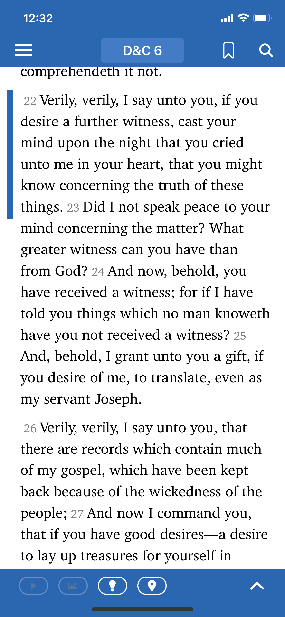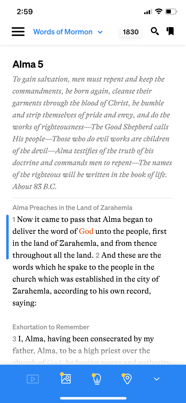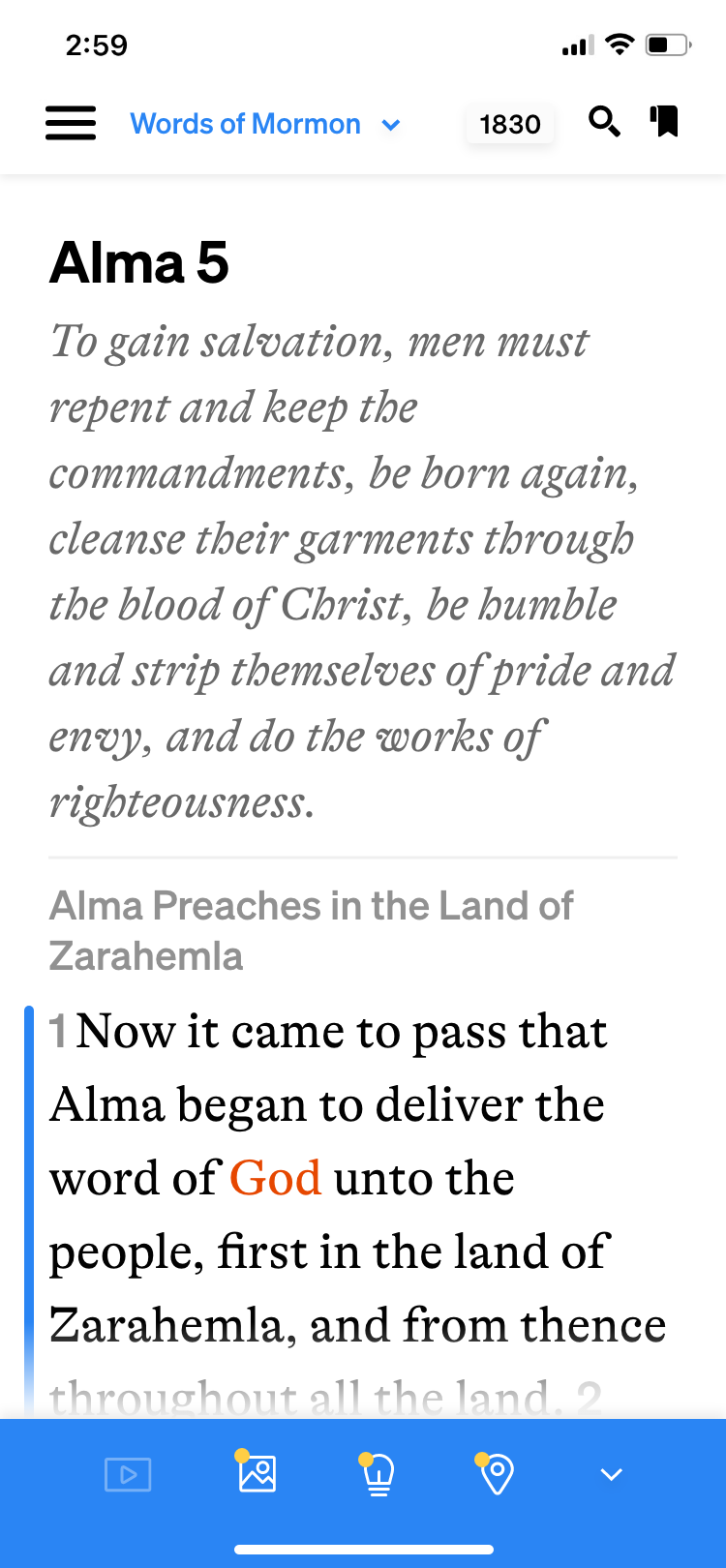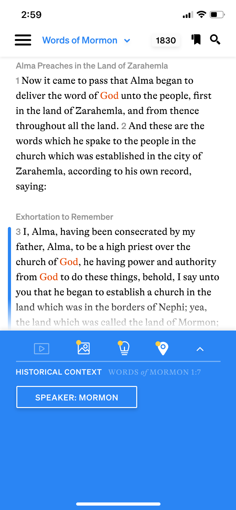 Previously, as soon as you entered the scriptures, the default was to have the bottom bar open. It took up about 30% of the screen and overshadowed the scriptures in weight with its deep blue color. The bottom bar adds context to the scriptures; on the left, the floating blue bar indicates the active verse, and as the user scrolls down, the blue bar follows their progress. The bottom bar correlates with this selected verse and suggests associated videos, images, insights, and historical setting information. While this may be helpful, I recommended defaulting to having this area collapsed unless tapped, so the reader can focus on the scriptures, the true purpose of this screen.