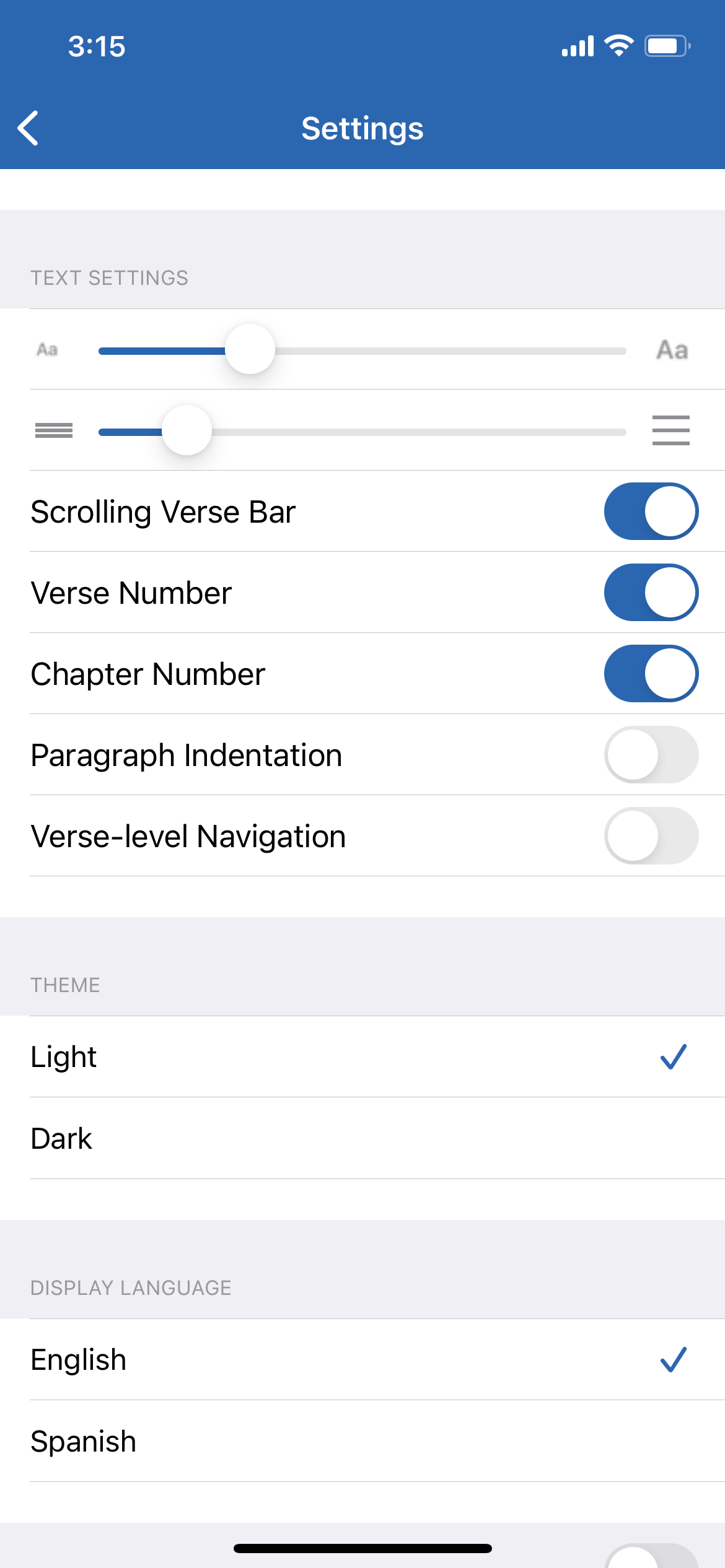 The user audience for ScripturePlus spans from young adults to older adults with declining vision. One feature we wanted to carry over from the old version of the app was the ability to view the app with larger or smaller text settings.