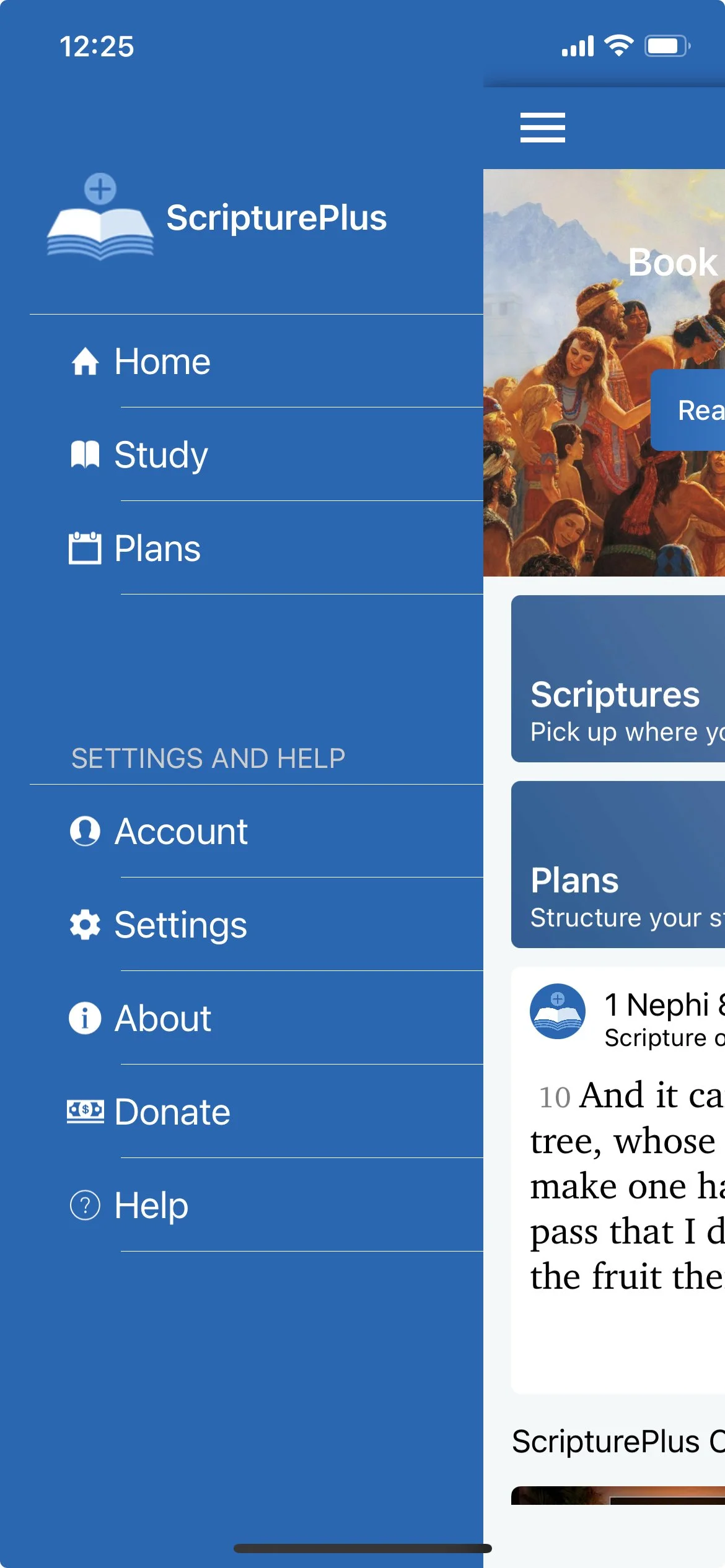 The first change I made was to add the ScripturePlus logo to the top of this page; since the user opens to this page every time they open the app, it is easily discovered to be the landing screen. The logo is visible here, but disappears on other pages where other navigation info is needed at the top of the page.